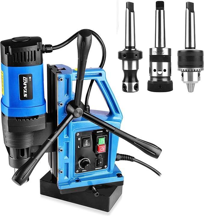 The STAKO SCY-2800RE+ magnetic core drilling machine is the ideal choice for complex metalworking projects. Designed for steel and shipbuilding, bridge and crane construction, railway engineering, wind turbines, and power plants, it is also indispensable in metalworking and automotive workshops. Its robust construction and efficiency enable precise drilling work, while its portability ensures flexible use in a variety of locations. The drill's adjustable magnetic base allows for 360° rotation to the right or left. *Set No. 3 with two drill chucks: 1. Weldon 19mm MT3/MK3 chuck with coolant tank 2. Standard drill chuck 3-16mm MT3/MK3 3. Tapping chuck M3 – M16 Technical details: Motor power: 2050 W Power supply: 230 V / 50-60 Hz Soft start: Yes Speed control: 0 – 340 rpm Right/left rotation for thread cutting: Yes Spindle taper: MK 3 Max. drilling diameter with core drill: 80 mm Max. drilling diameter with solid drill: 28 mm Height: Max. 590 mm / Min. 405 mm Working stroke: 185 mm Magnetic force: 17000 N (1700 kg) Magnetic base dimensions: 200 x 105 mm Weight: 17 kg Scope of delivery for Set 3: 1 x magnetic core drilling machine SCY-2800RE+ 1 x MK3 19 mm Weldon drill chuck 1 x 500 ml coolant tank 1 x M3 – M16 tapping chuck 1 x B16 / 3-16 mm keyed drill chuck 1 x chuck key 1 x MK3 mandrel for drill chuck attachment 1 x drift key 1 x MK3 / MK2 reducing sleeve 1 x Allen key 3 x rotary handles 1 x safety belt 1 x spare carbon brushes for the motor 1 x spare fuse 1 x operating instructions 1 x carrying case